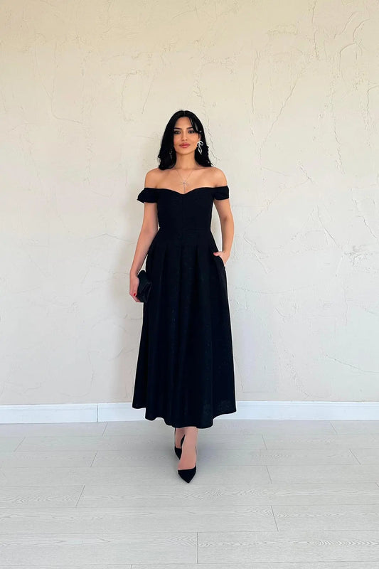 Schwarzes Off-Shoulder-Jacquard-Midikleid – Sommerliche Eleganz im klassischen Stil