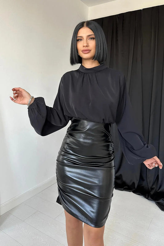 Schwarzes Kleid aus Kunstleder und Satin – Eleganter Power-Look in einem Stück