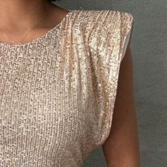 The broad shoulders with subtle gathers give the top a powerful yet feminine structure. The sparkling sequin fabric creates a luxurious sheen that immediately catches the eye—ideal for elegant, statement-making looks.