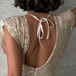 The elegant back view showcases a plunging neckline, stylishly tied with a delicate satin ribbon. The sparkling fabric subtly accentuates the shoulders, creating a glamorous look with a touch of sophistication.